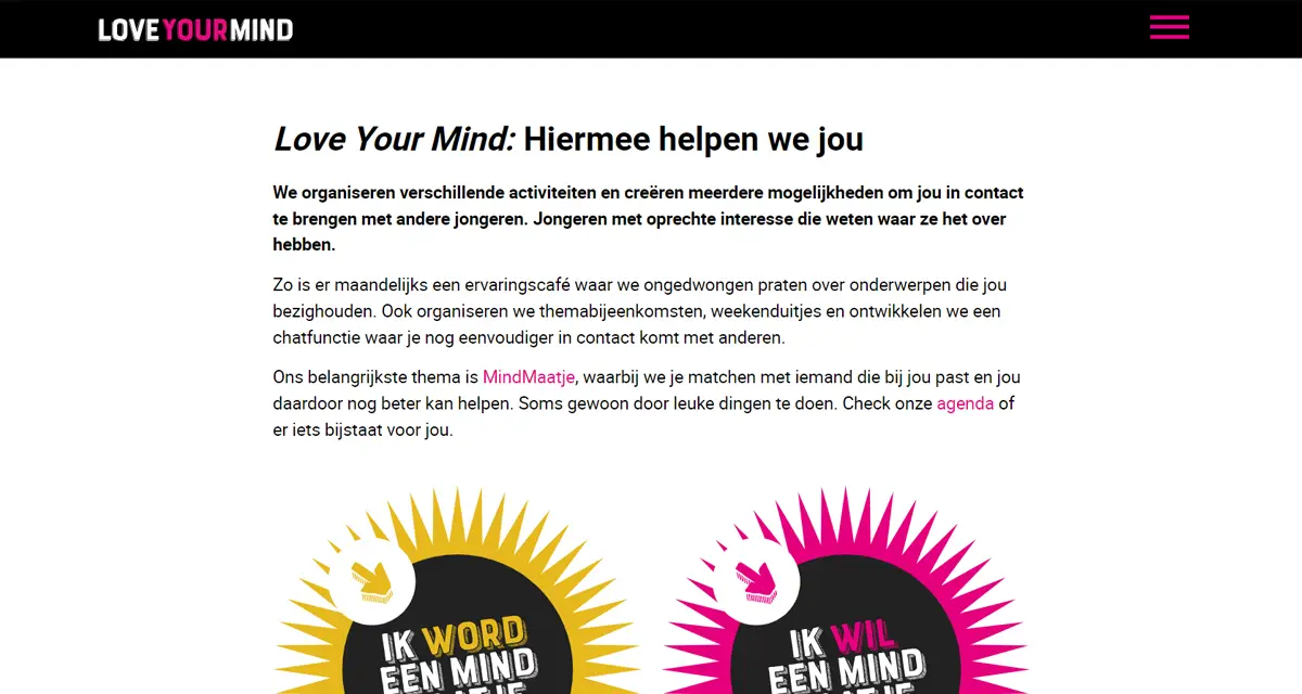 Love Your Mind is een project door en voor jongeren over mentale gezondheid. Jongeren worden gematch met andere jongeren met zorgen of problemen. Deze ondersteunen ze door te met ze te praten, whatsappen of samen leuke dingen te doen.