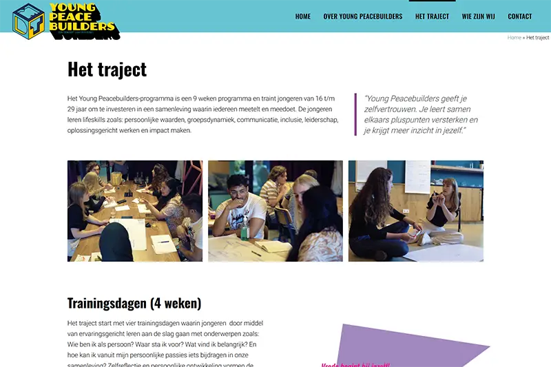 Young Peacebuilders geeft jongeren de kans om zichzelf te ontwikkelen én iets te betekenen voor de samenleving. Door coaching en praktijkervaring ontdekken zij hun talenten en leren zij hoe ze positieve impact kunnen maken.